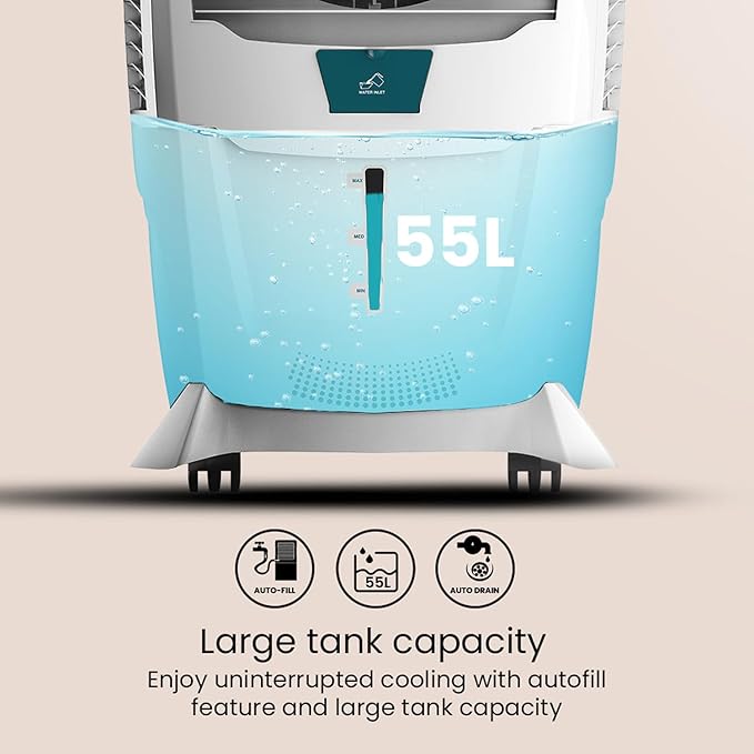 • Auto Fill & High Tank Capacity: The air cooler comes with 55L tank capacity which allows you to experience cool air for a long time while the auto fill allows continuous water supply.