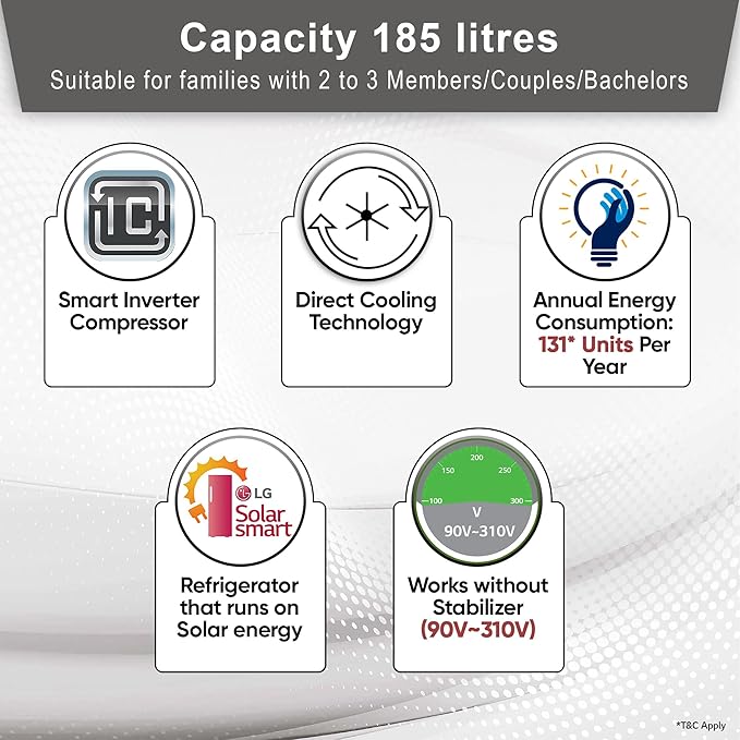 - Energy Rating: 5 Stars Refrigerator – Best in class Efficiency (Higher star ratings lead to lesser electricity consumption lowering bills) | Annual energy consumption – 131 Units per year | BEE Label period – 01st Jan 2023 to 31st Dec 2025 | The revolutionary Smart Connect technology in LG Direct Cool refrigerator helps you connect your refrigerator to home inverter in case of power cuts. (T&C Apply)