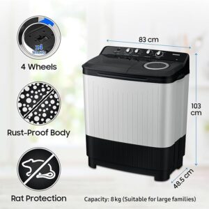 - Capacity 8 kg: Suitable for large families | Water Pressure: (0.05~0.3MPa)(0.5~3.0kg.f/cm²) | Water Consumption : Refer to BEE label